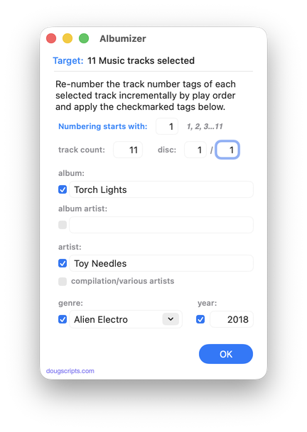 This script will renumber the track number tag of the selected tracks incrementally in their play order, as well as providing track count, disc number and disc count tags and, optionally, additional album-oriented tags.