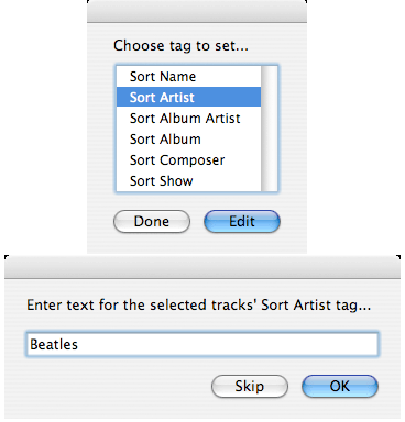 This script will allow you to batch-set the sorting tags ("Sort Name", "Sort Artist", "Sort Album Artist", "Sort Album", "Sort Composer", "Sort Show") of the selected tracks, rather than manually doing so one track at a time or globally using "Apply Sort Field". Requires iTunes 7.1 or better.