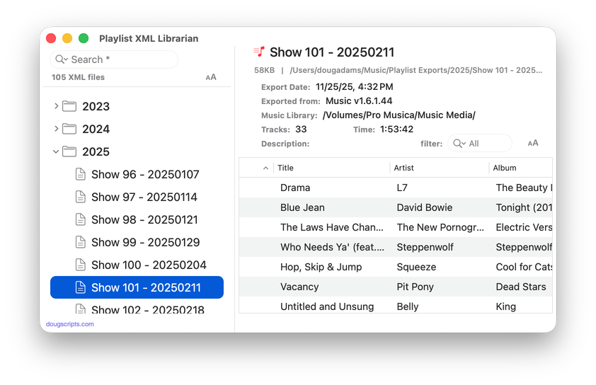For a couple of years recently, I did a weekly two hour streaming radio show. I created a playlist of songs for a each show and kept the playlists in a "Shows Folder" in the Music app. All one hundred or so of them. I didn't want to delete them. But having them around, even inside a Playlist Folder, didn't make a lot of sense either. So it occurred to me to just export them as XML files and keep them Just In Case.